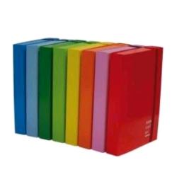 CARTELLE CON ELASTICO PIATTO NEW COLOR. Cartelle rivestite in carta monopatinata plastificata, con 3 lembi e chiusura con elastico piatto in tinta. DORSO 3