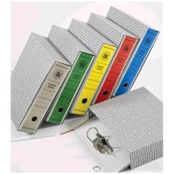 REGISTRATORE UNIVERSALE. FORMATO COMMERCIALE MIGNON. Custodia rivestita con carta usomano, certella rivestita con carta monopatinata. Meccanismo a leva, risguardo in carta usomano bianca.