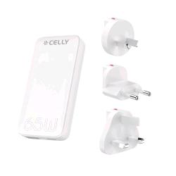 CELLY UNIVERSAL WALL CHARGER MULTIPLUG CARICABATTERIE DA RETE GaN 65W INTERNAZIONALE CON ADATTATORI PER TUTTI I PAESI DEL MONDO 1 x USB-A- 1 x USB-C EU/UK/AUS/US BIANCO