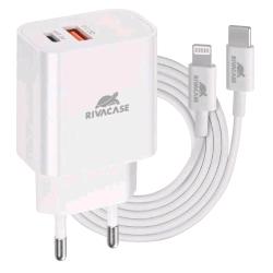RIVACASE CARICABATTERIE DA RETE PD 20 W 2 USCITE 1 x USB-A 1 x USB-C + CAVO DA USB-C A LIGHTNING MASCHIO/MASCHIO 1 MT BIANCO