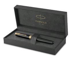 SONNET LACQUE BLACK GT ROLLER F. Cappuccio e corpo nero laccato impreziositi da dettagli e clip con finiture in oro. Penna roller con punta fine in acciaio inossidabile. Assemblata e controllata a mano per garantire una qualità perfetta. Disponibile in una vasta gamma di modelli e finiture. Fornita in una confezione regalo PARKER di altissima qualità.