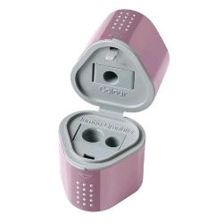GRIP. Temperino ergonomico adatto per le matite in grafite e colorate, rotonde, esagonali o triangolari nel formato jumbo e standard. Fornito di vite di sicurezza. Adatto ai bambini. Forma triangolare ergonomica. Con doppio serbatoio. 3 Fori. Colore prodotto: rosa.